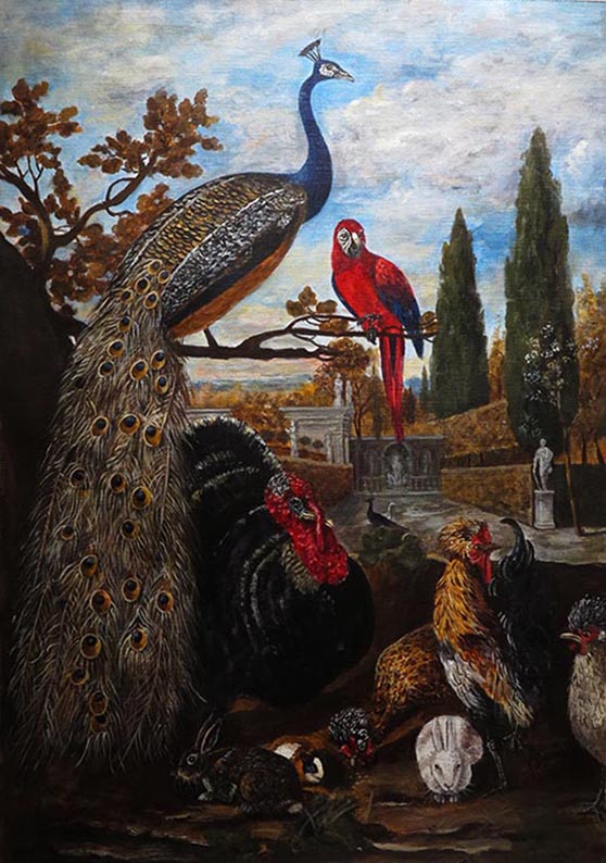 Paon , dindon , perroquet , lapins et coqs dans paysage. Peacock , turkey , parrot , rabbits , hens in a landscape. Acrylique 54 x 76 cm